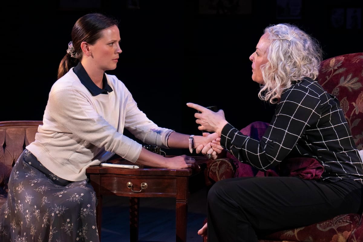 Just as the verbal sparring threatens to overwhelm the play, Linda and Sylvia’s argument escalates to the point where both go offstage, leaving Hilda and Jerry alone. Taylor as Hilda has been dutifully observing the conversation but not commenting on the debate and remains coy when pressed for what she’s heard by Jerry.