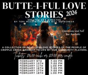 BUTTE-T-FUL Love Stories 2024A collection of real-life love stories of the people of Cripple Creek brought to life by our community players. 0 events found. Notice There were no results found. Notice There were no results found. Events Search and Views Navigation Search Enter Keyword. Search for Events by Keyword. Enter Location. Search for Events by Location. Find Events Event Views Navigation Summary List Today Upcoming Upcoming Select date. Previous Events Today Next Events