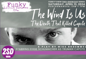Funky’s new series and first two-day of 2024 follows the life of author Truman Capote. The play focuses on how his most-acclaimed work, In Cold Blood, led to his life collapsing and directly contributed to his premature and tragic death in 1984. Eddie Schumacher stars as Truman Capote in this one-man show.