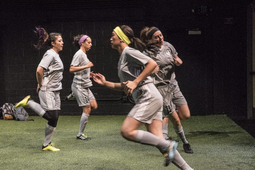 On its surface, “The Wolves” is a play about a girls’ soccer team. Known only by their team numbers, the show opens on the eight young women on the team doing their pre-game stretches while bantering and arguing about everything from feminine hygiene products to the latest school gossip.