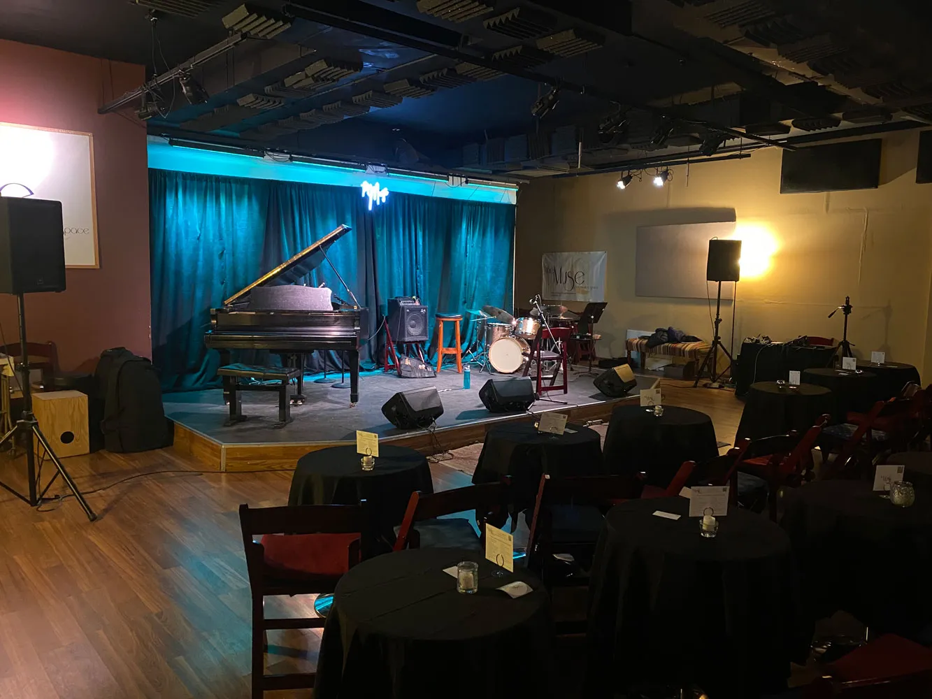 Muse Performance Space is an intimate venue featuring a 19' x 12' stage with professional lighting and sound capabilities. The space seats up to 80 guests in flexible configurations with movable chairs and 10 adjustable cafe-style tables. Technical amenities include a Yamaha 6' grand piano (professionally tuned monthly), 8 LED Par Cans with 4 Bar lights and DMX Master 192 dimmer, digital Soundcraft Expression Si One 16-channel board with JBL mains and Yamaha monitors, and a variety of professional microphones with cables and stands. The venue offers a bar area for snacks, beer and wine, two refinished unisex bathrooms, wheelchair accessibility, storage for cases and equipment, and optional live-stream/recording and sound technician services.